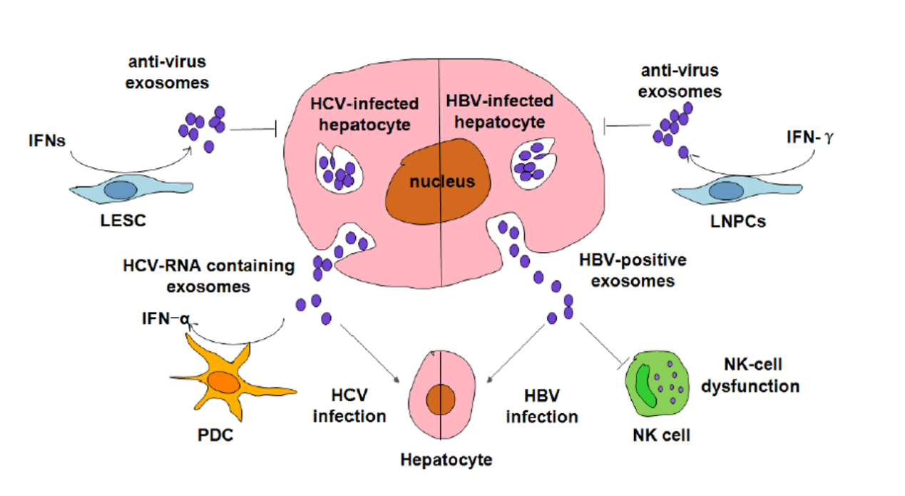 与HCV类似,HBV感染患者的血清中分离到的外泌体同样携带HBV核酸分子和蛋白质。HBV阳性的外泌体会主动转移HBV到肝细胞中。外泌体中HBV核酸分子还会抑制RIG-1和下游信号通路,导致NK细胞功能紊乱。