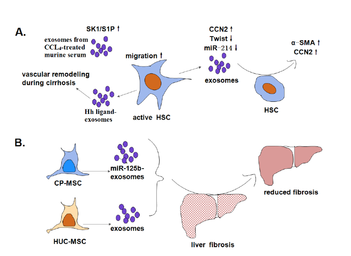 外泌体可以调控星状细胞(HSC)活化,并参与HSC细胞迁移的进程。活化的HSC来源的外泌体中,CCN2表达升高,Twist1和miR-214表达被抑制,这些外泌体还能诱导静止的HSC细胞表达CCN2。此外,Twist1可以诱导miR-214表达从而抑制CCN2的表达。CCL4处理的外泌体和外泌体SK1/S1P会诱导HSC迁移。