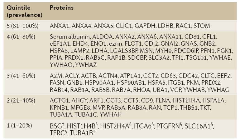 尿液EVs蛋白质组数据库中最常见的Top100 EV 蛋白列表