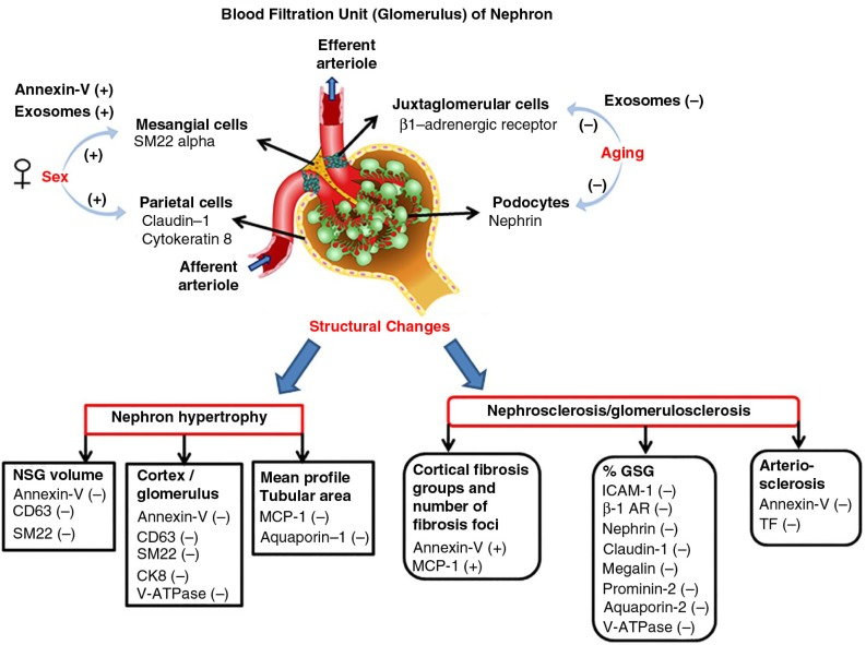 图示不同性别、年龄、肾结构改变人群中,不同蛋白标记的尿液EVs类型的情况。(-)表示下降,(+)表示上升。
