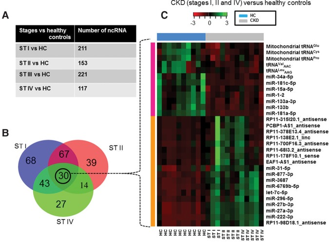 图示慢性肾病患者尿液中的外泌体ncRNA丰度。