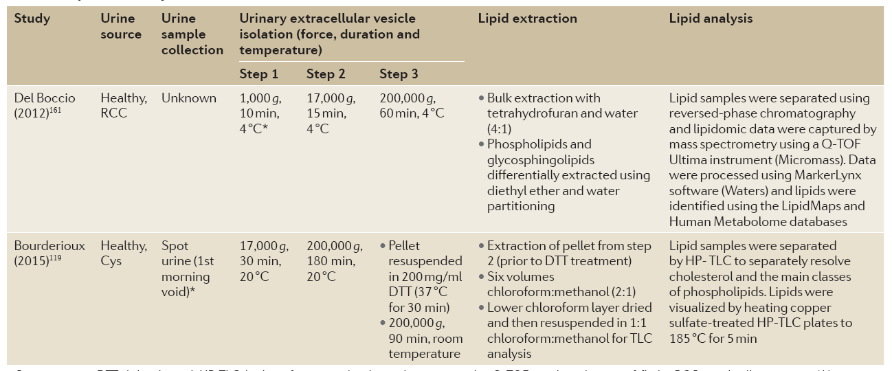 脂质是囊泡的主要组成成分,外泌体、微泡和凋亡小体的脂质组成大体相似,仅存在极少的差别,这些细微的差别同样值得研究。回顾已发表的文献和常见数据库,作者找到了2篇关于尿液囊泡脂质的研究,具体信息如下。