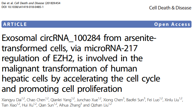 1. Dai X, Chen C, Yang Q, et al. Exosomal circRNA_100284 from arsenite-transformed cells, via microRNA-217 regulation of EZH2, is involved in the malignant transformation of human hepatic cells by accelerating the cell cycle and promoting cell proliferation. Cell Death Dis, 2018, 9(5):454 (PS:文章所有图均来自这条文献)