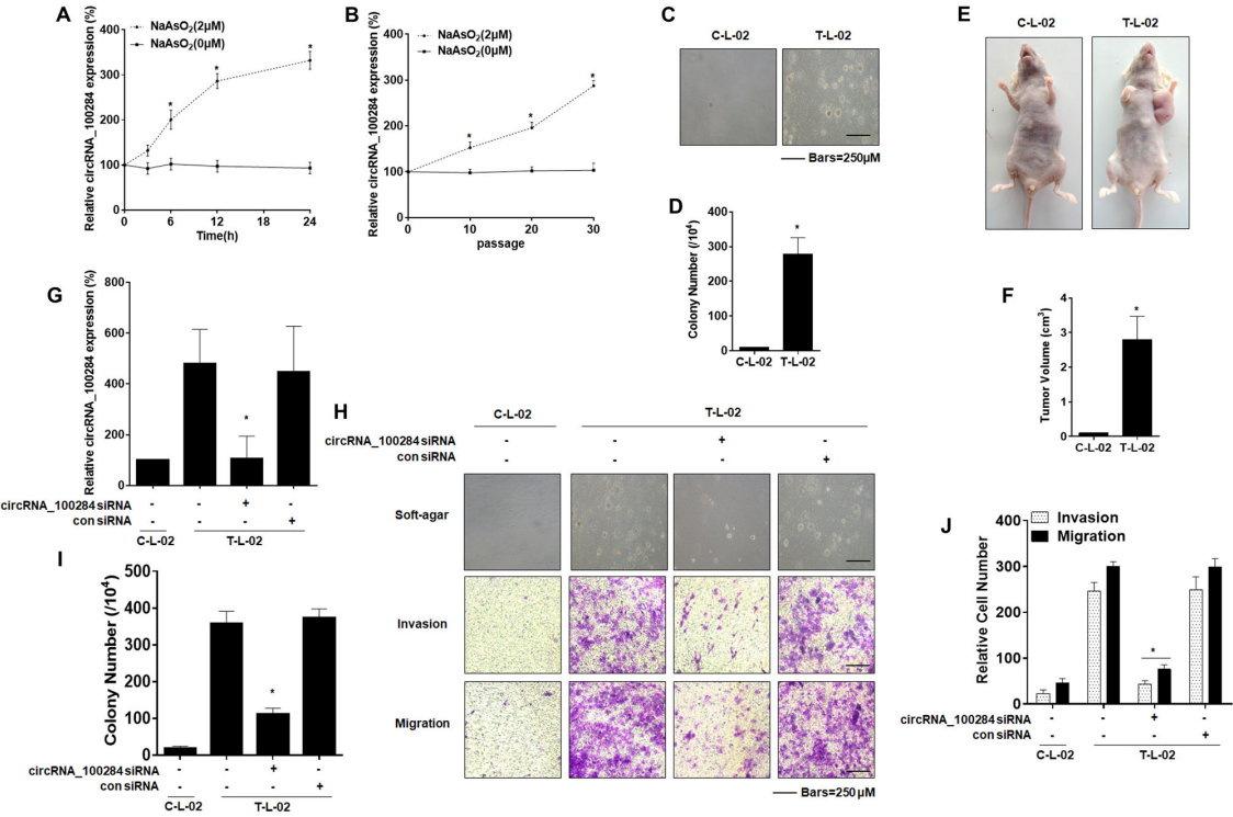 - 首先探讨circRNA_100284 在As-T-L-02细胞发挥致癌效应中的作用。亚砷酸盐处理L-02细胞后,L-02细胞中的circRNA_100284水平升高,具有时间依赖性和细胞代数依赖性。同时亚砷酸盐处理后细胞的锚着非依赖性生长能力增强(软琼脂中形成细胞克隆团数目),体内成瘤能力增强。As-T-L-02细胞经转染circRNA_100284的靶向siRNA后,circRNA_100284水平降低,细胞锚着非依赖性生长能力降低,细胞迁移和侵袭能力降低。在As-L-02-p20细胞(细胞代数20)过表达circRNA_100284后,细胞锚着非依赖性生长能力增强,细胞迁移和侵袭能力增强。