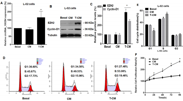 As-T-L-02细胞培养上清处理正常L-02细胞后,(Fig. 2A)RT-PCR检测胞内circRNA_100284水平;(Fig. 2B, C)WB检测EZH2和Cyclin-D1的蛋白水平;(Fig. 2D, E)流式检测细胞周期各比例;(Fig. 2F)CCK8法检测正常L-02细胞的增殖能力。