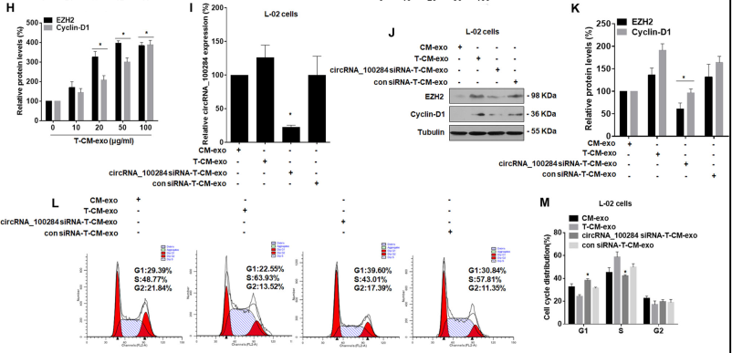 给予As-T-L-02细胞分泌的外泌体处理后,RT-PCR检测到正常L-02细胞的circRNA_100284水平升高(Fig. 4A),WB检测EZH2 和 cyclin-D1蛋白水平升高(Fig. 4E-H),流式检测细胞周期加快(Fig. 4B, C),CCK8法检测细胞增殖能力增强(Fig. 4D)。给予经转染circRNA_100284 siRNA的 As-T-L-02细胞分泌的外泌体处理后,正常L-02细胞中circRNA_100284水平降低(Fig. 4I),EZH2 和 cyclin-D1蛋白水平不再升高(Fig. 4J, K),细胞周期G1/S转换降低(Fig. 4L, M)。