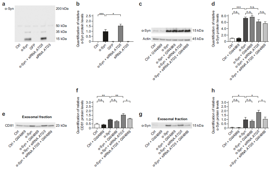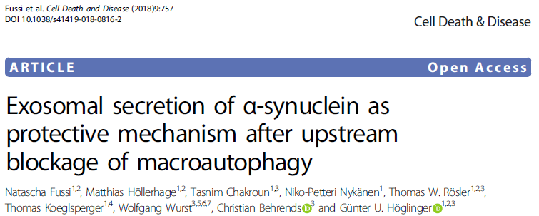 - Fussi N, Höllerhage M, Chakroun T. et al..Exosomal secretion of α-synuclein as protective mechanism after upstream blockage of macroautophagy. Cell Death Dis. 2018 Jul 9;9(7):757. doi: 10.1038/s41419-018-0816-2.