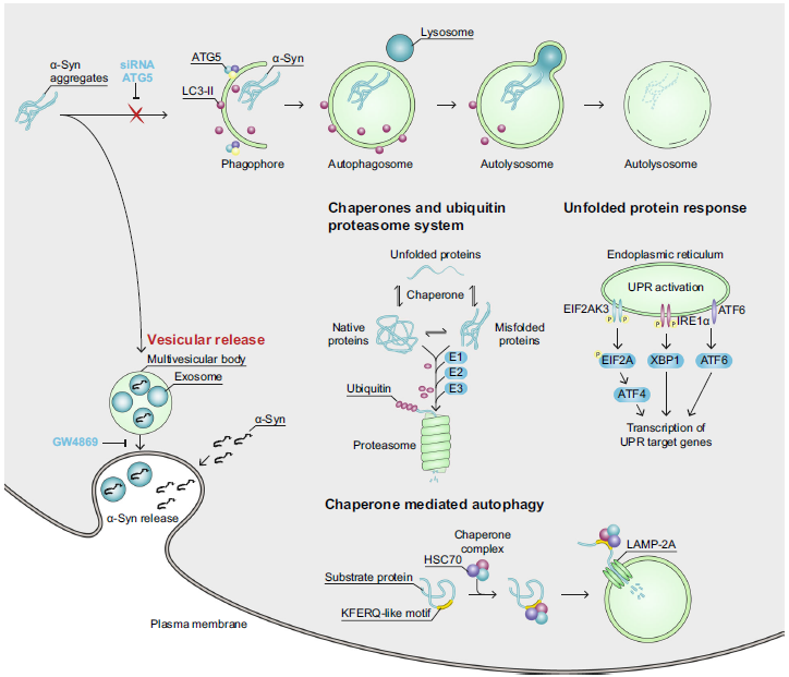 α-Syn的基因SNCA发生点突变(如A30P,G51D,A53E,A53T,E46K)会导致常染色体显性的PD。另外,野生型SNCA的二倍体和三倍体也会导致常染色体显性PD。但是,单基因形式的PD是罕见的,而且大多数病例是散发性的。尽管如此,全基因组关联分析一致发现,SNCA的单核苷酸多态性为散发性的PD的主要危险因素。 α-Syn可以由细胞内不同的蛋白质降解机制降解,包括泛素 – 蛋白酶体系统(UPS),伴侣介导的自噬(CMA)或巨自噬(macroautophagy)。
