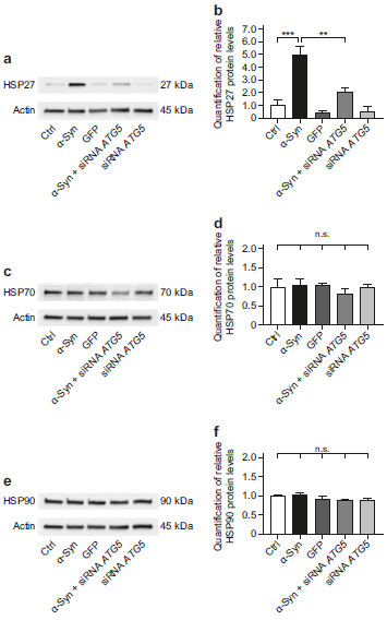 分子伴侣靶向不可恢复地错误折叠的蛋白,以通过UPS和自噬途径降解。α-Syn过表达会增加胞内的HSP27蛋白水平,而α-Syn过表达+ATG5 siRNA组的HSP27蛋白水平没有明显的上调(a-b)。相比于其它组别,α-Syn过表达+ATG5 siRNA组的HSP70和HSP90蛋白水平也没有得到明显的上调(c-f)。