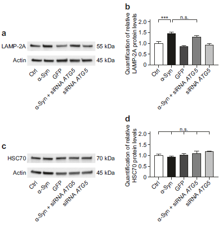 含有KFERQ-基序的蛋白质底物可以被细胞溶质伴侣,大小约为70 kDa的热休克同源蛋白HSC70所识别,然后与分子伴侣一起锚定在溶酶体相关膜蛋白质类型2A(LAMP-2A),被内化到溶酶体降解。α-Syn过表达可以增加LAMP-2A 的蛋白水平,而ATG5 siRNA处理并没有在此基础上增加LAMP-2A 的蛋白水平(a-b)。而且各组间的HSC70蛋白水平也没有明显的差异(c-d),进一步说明了α-Syn过表达+ATG5 siRNA组不会活化补偿性CMA相关蛋白。