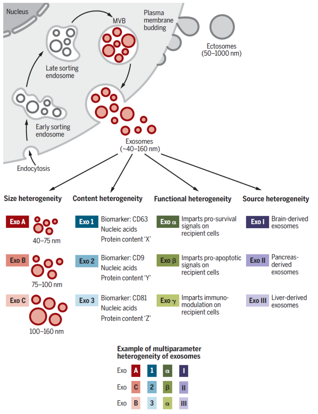 细胞外囊泡(extracellular vesicles,EVs)是广泛存在的细胞外膜泡结构,从原核生物到真核生物都有,细胞外囊泡可分为Ectosomes和 Exosomes。Ectosomes主要从细胞外膜通过“出芽”等方式形成,直径从50nm~1μm,按大小可分为microvesicles,microparticles,large vesicles。Exosomes即外泌体,直径在40~160nm,平均100nm,主要来源于细胞的内涵体(Endosome)。外泌体由细胞内的内涵体通过胞吐作用释放到胞外形成的,而Ectosomes则直接由细胞外膜通过“出芽”方式形成,因此两者是完全不同的细胞外囊泡成分,但两者的直径有重叠的区间,目前的分离和研究手段还不能非常有效的区分二者。