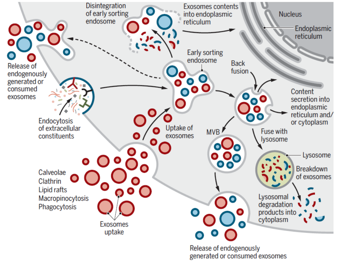 外泌体可能作为细胞之间物质和信号通讯的途径,不同的细胞通过分泌携带不同组分的外泌体实现细胞间通讯,这些外泌体被受体细胞吸收,通过物质交换或释放内含物实现物质和信号的交流。这方面比较典型的发现是KRas突变的胰腺癌细胞可促进大胞饮作用促进外泌体的吸收。黑色素瘤细胞通过促进细胞质膜与外泌体的融合实现对外泌体组分的吸收。而神经分泌的PC12细胞在主要通过网格蛋白有被小泡吸收适当大小的外泌体。小鼠体内研究表明一些外泌体还可以直接输送mRNA给受体细胞,尤其是急性或慢性感染刺激下。外泌体的蛋白组分与来源细胞密切相关。例如EGFR-vIII突变的胶质母细胞瘤细胞来源的外泌体往往携带更多的浸润分子。炎性因子刺激的神经干细胞释放携带IFNγ及其受体的外泌体,在受体细胞中特异性激活STAT1通路。