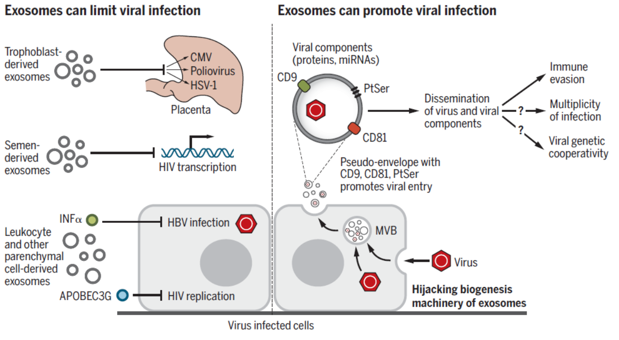 哺乳动物生殖妊娠和胚胎发育的过程需要一些精确的细胞间通讯机制,外泌体在其中起到了重要作用。人类的精液,羊水,血液和母乳均包含外泌体。多例人类精浆中分离的外泌体检测到包含let-7a,let-7b,miR-148a,miR-375和miR-99a,这些miRNAs调控了一些白介素的表达水平,与生殖器驻留免疫有关。精浆来源的外泌体还有助于阻断HIV的感染。胎盘滋养细胞来源的外泌体可将一类miRNA输送至非胎盘细胞,促进自噬和病毒防御机能。有趣的是,妊娠晚期小鼠的血浆外泌体可以诱导近产期的孕鼠早产,但对妊娠早期的小鼠没有影响。母乳中的外泌体也对婴儿的免疫系统有帮助。