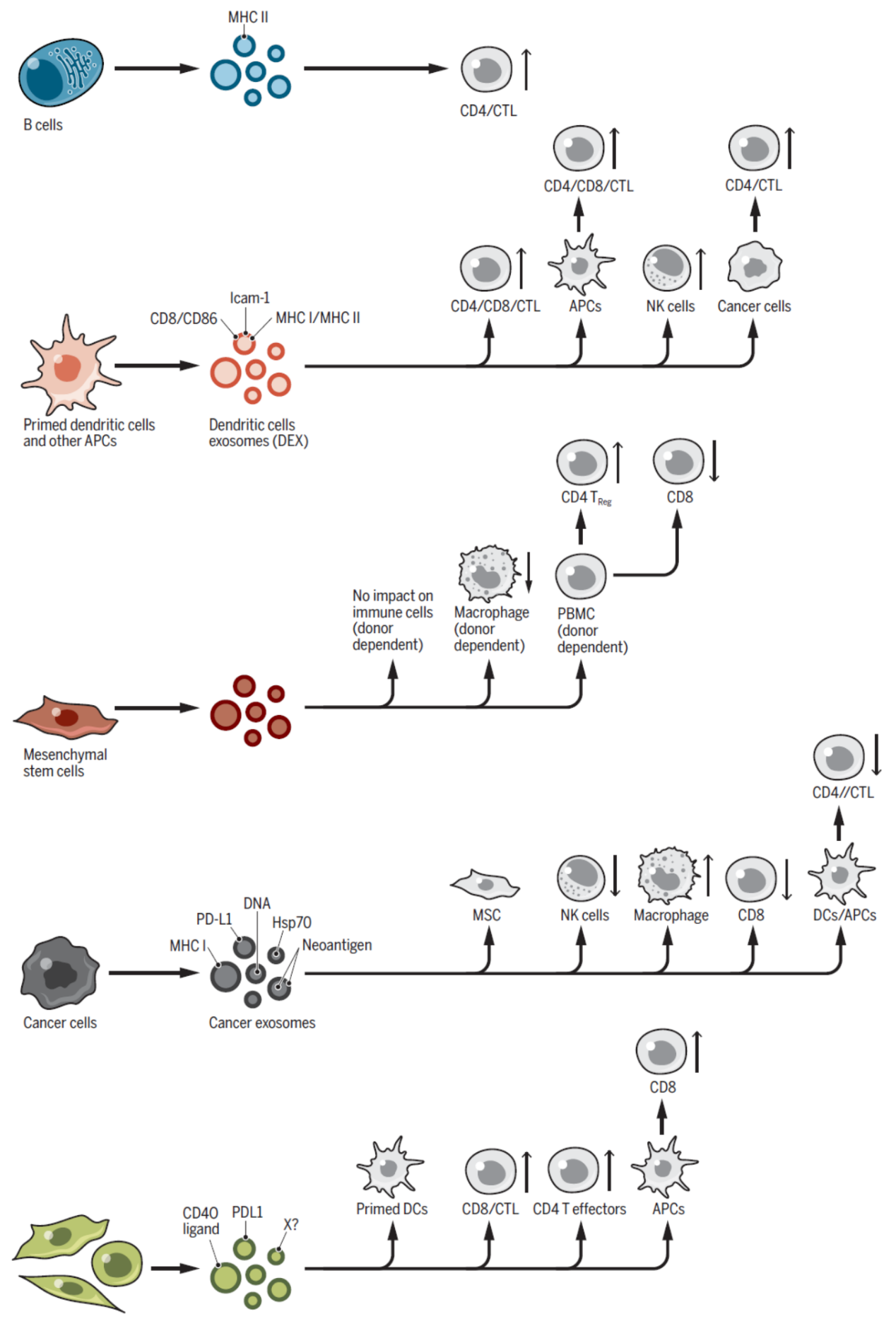 由抗原递呈细胞来源的外泌体可以直接通过携带的结合了抗原肽的MHC-II激活T细胞,但外泌体单独对T细胞的激活作用比较有效。有趣的是,携带了结合肿瘤特异性抗原的MHC-II的外泌体在小鼠体内可显著抑制肿瘤生长。这些外泌体可能通过激活抗原提呈细胞间接激活naïve T细胞和B细胞,也可能促进CD4+T细胞的扩增。巨噬细胞来源的外泌体还可能促进了抗细菌免疫效应的激活过程。外泌体携带的核酸分子也参与了先天性和适应性免疫活动。此外,来自间充质干细胞,甚至癌细胞的外泌体也在免疫活动过程中发挥了特殊的作用。