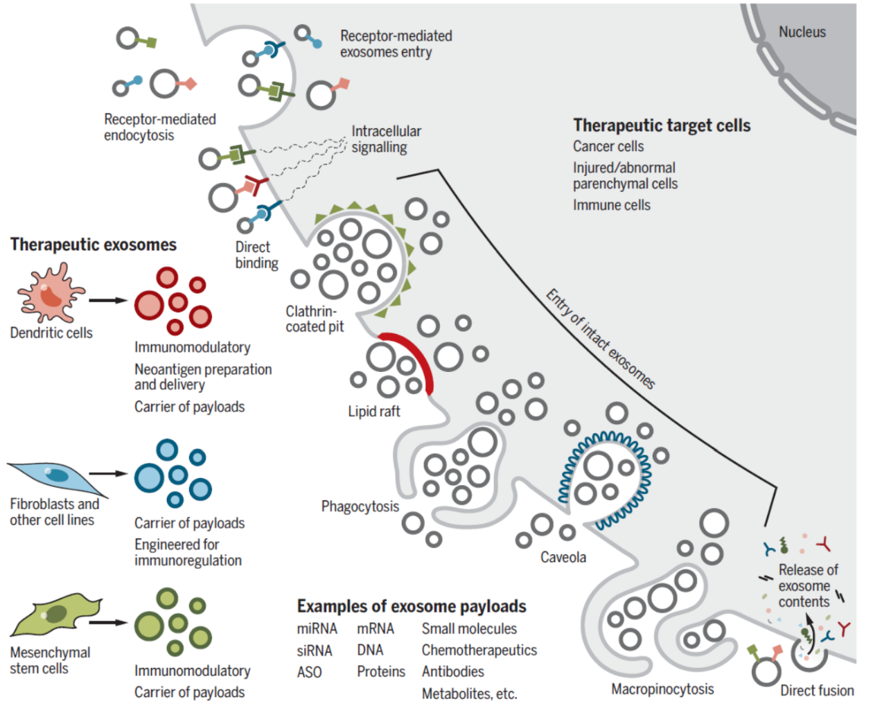 一些研究表明,小鼠体内外泌体的免疫清除率比脂质体低,因此可以作为潜在的给药工具。基于外泌体实现siRNA的定向给药已经取得了一些可喜的进展。还有一些研究利用外泌体实现对肿瘤免疫机制的干预。