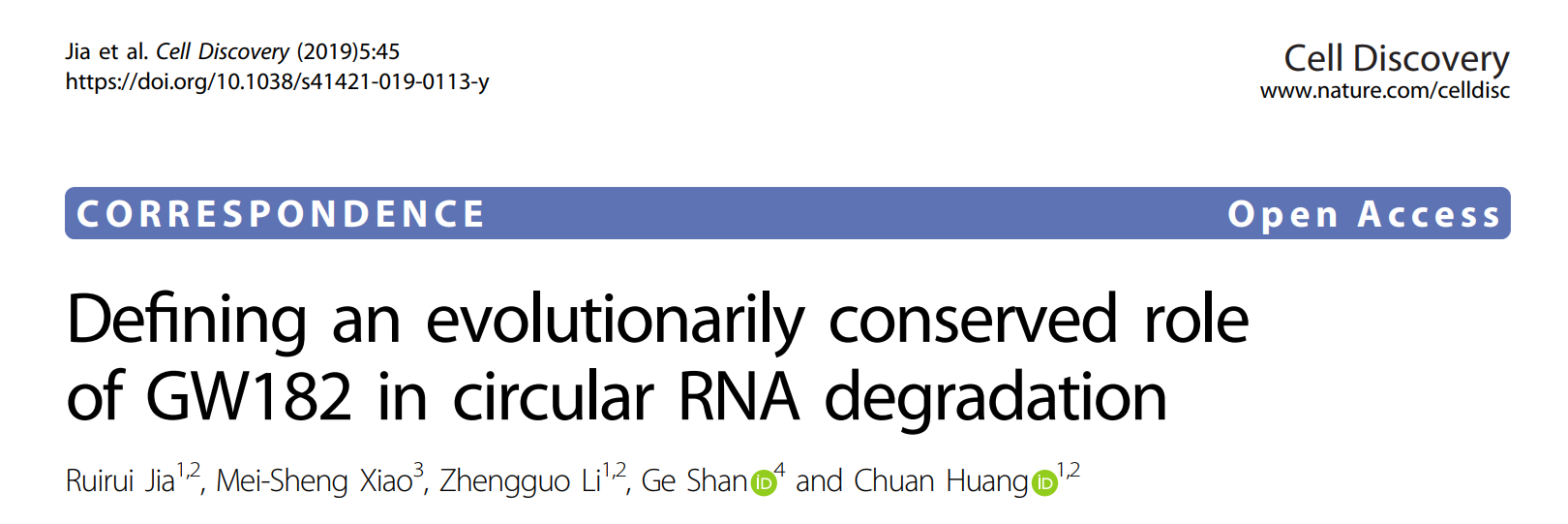 1. Ruirui Jia, M.-S.X., Zhengguo Li, Ge Shan and Chuan Huang, Defining an evolutionarily conserved role of GW182 in circular RNA degradation. Cell Discovery, 2019.