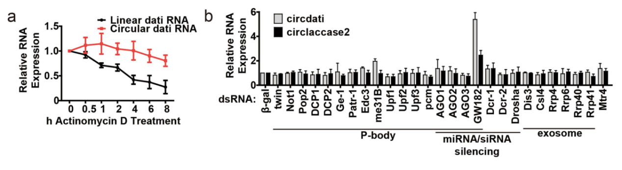 本文作者基于RNAi文库技术在果蝇DL1 和 S2细胞中进行筛选分析,文库由靶向31种已知的RNA代谢和降解作用有关的基因构成。通过QPCR检测dati和 laccase2基因的线性和环状RNA的稳定性状态的结果来分析靶分子是否参与circRNA的降解作用。筛选的结果表明GW182干扰之后,dati和 laccase2的环状RNA丰度均有显著富集,其他被筛选的分子变化趋势不显著。因此作者怀疑GW182参与circRNA的降解作用。