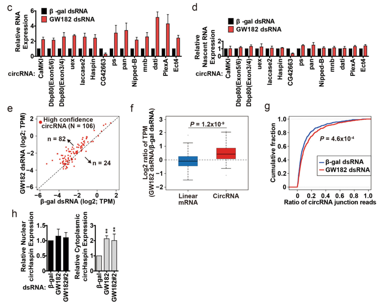 (2)全转录组分析结果表明干扰GW182后绝大部分circRNA被富集(Fig. e-g);
