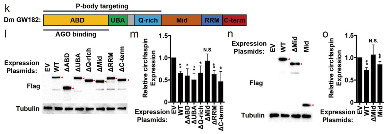 GW182的蛋白序列主要由6个结构域构成,分别是N端的ABD、UBA、Q-rich、mid、RRM和C-term。为分析GW182介导circRNA降解的主要功能结构域,作者分别构建了删除各个结构域的突变体,分析突变体过表达后circRNA稳定性是否受到影响。结果发现删除Mid结构域后circRNA的丰度不再发生变化,其余的突变体均不影响circRNA的降解作用。与此同时,单独过表达Mid结构域就能起到与全长SW182相似的作用效果。这些实验结果表达Mid结构域在circRNA降解作用过程中起到关键作用。