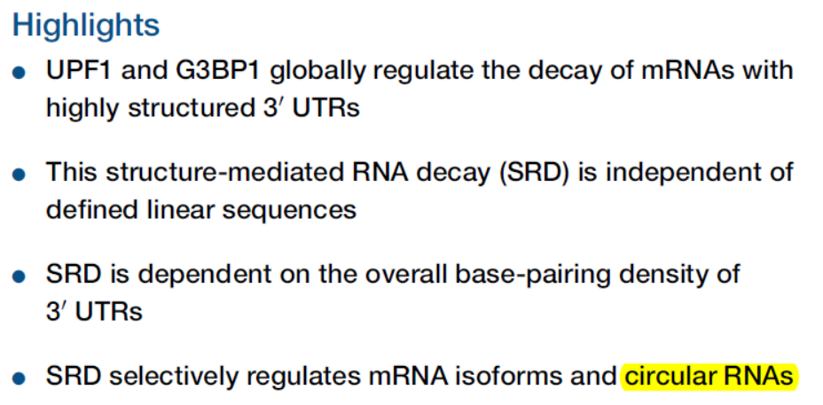 本文主要发现UPF1和G3BP1可以介导RNA结构依赖的降解(SRD),这种机制与RNA具体的序列没有直接关系,但与mRNA的3’-UTR的结构有关。一些结构比较复杂的circRNA也可以经过该机制降解。本文的大部分篇幅是介绍如何发现并验证UPF1和G3BP1在mRNA降解中的作用的,仅在最后提到了circRNA也可以与mRNA共享这一降解机制。那么,作者如何发现并证明UPF1和G3BP1在RNA降解中的作用的?可以通过这一机制降解的circRNA有什么特征?
