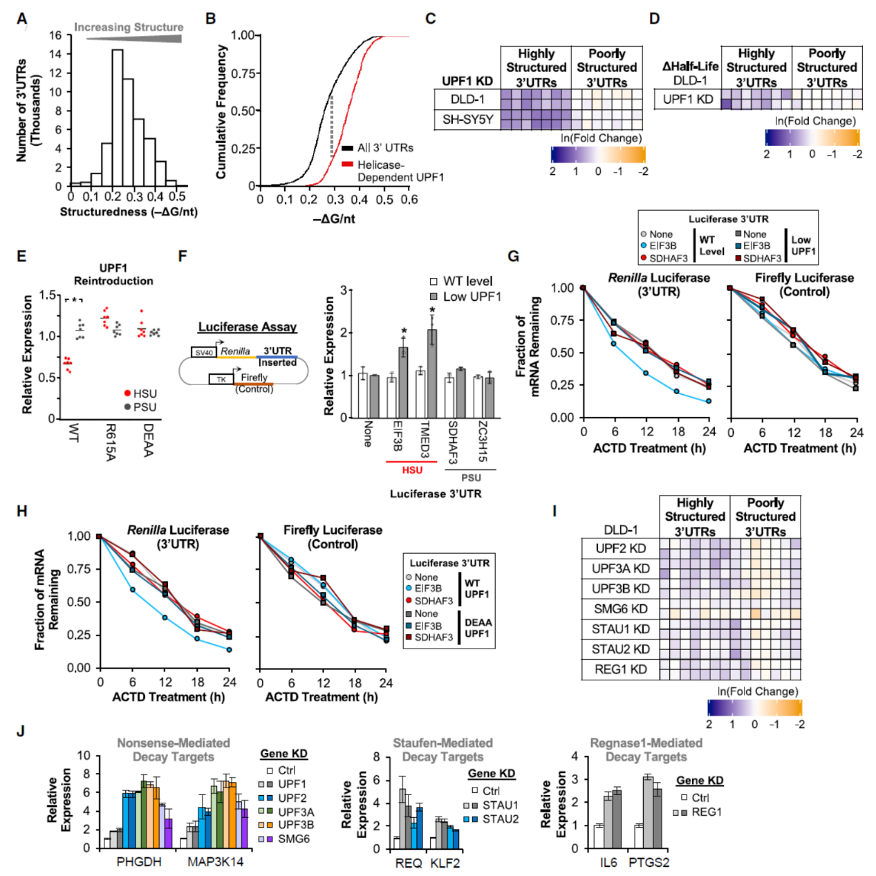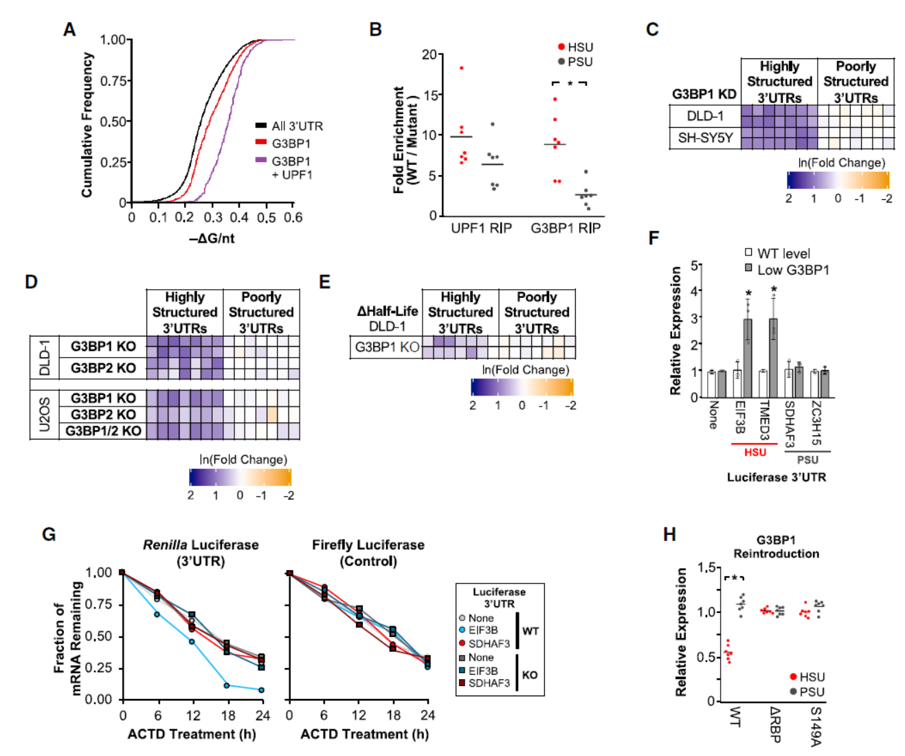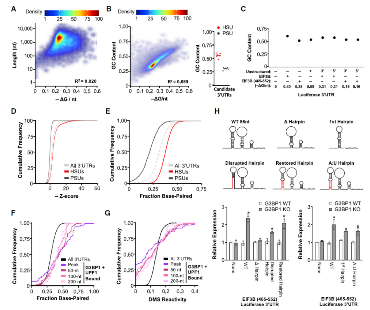 为进一步验证SRD在全基因组水平调控RNA降解的作用情况,作者分析了G3BP1敲除细胞全转录组情况,分析表明受G3BP1敲除影响降解作用的RNA倾向于属于HSU类型的RNA分子,其3’-UTR往往具有更强的碱基互补作用,即更有可能形成更多的高级结构。