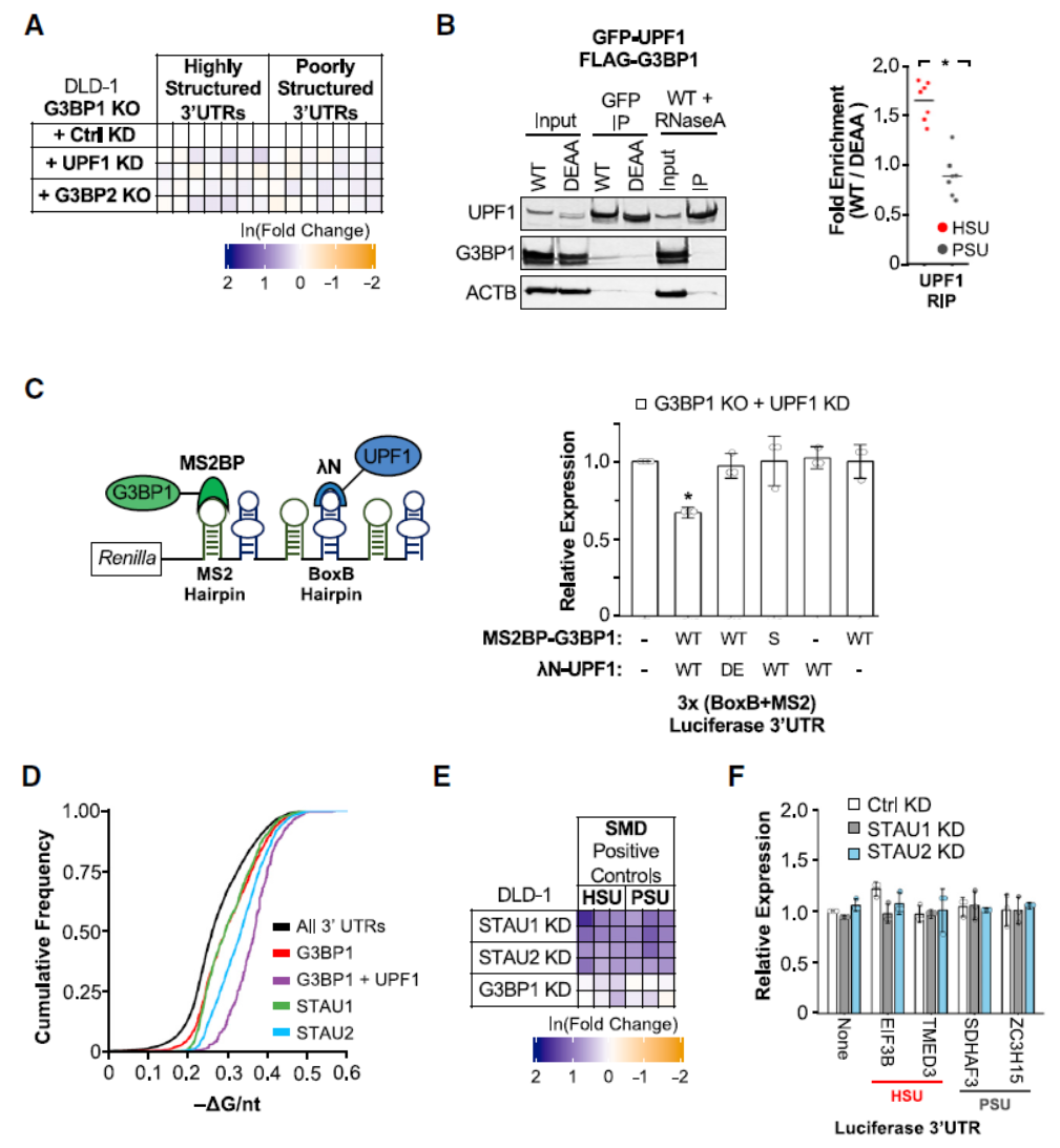 UPF1与G3BP1都参与3’-UTR结构复杂的mRNA的稳定性有关,它们在调控这类RNA降解的机制中是怎样的关系?作者基于单独或共同敲降UPF1和G3BP1,蛋白互作分析证明了UPF1与G3BP1相互作用可以调控靶RNA的降解。有趣的是,作者所发现的这种基于UPF1和G3BP1的RNA降解途径(SRD)与另一种基于3’-UTR的RNA降解机制Staufen-mediated decay (SMD)途径并不相同,因为敲降SMD途径的两个关键因子STAU1和STAU2并不会阻止本文挑选的HSU类RNA降解作用。