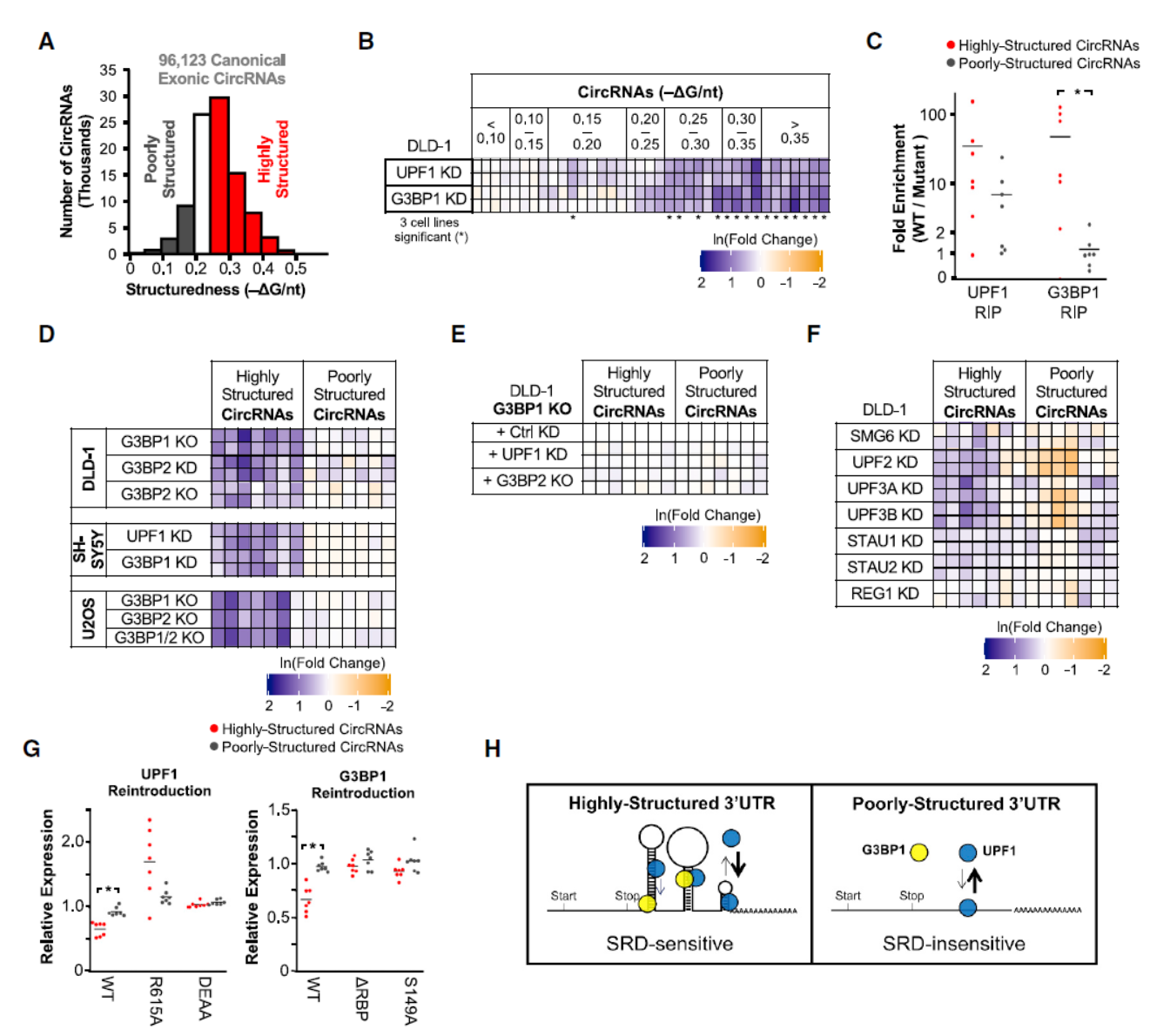 在文章的最后,作者也分析了是否存在受SRD机制调控降解的circRNA。作者首先分析了circBase数据库中所有外显子来源circRNA的二级结构预测情况,其中找出了100个circRNA具有潜在的复杂结构状态,其中有37个在DLD细胞中高表达。分别敲降UPF1和G3BP1分析丰度变化趋势,结果发现,高级结构越复杂的circRNA分子在分别敲降了UPF1和G3BP1后其丰度变化越小,说明存在复杂结构的circRNA分子有可能会受到SRD机制调控。进一步分析表明G3BP1敲除后UPF1敲降不再影响这些circRNA的降解,并且敲降STAU1或STAU2后也不能改变,因此可以排除SMD途径降解的干扰。说明在circRNA中可能存在与mRNA中SRD机制相似的降解途径,但与mRNA中的情况稍有不同,UPF1和G3BP1结合结构复杂和结构简单的circRNA分子的能力略有不同,具体原因还不明确。