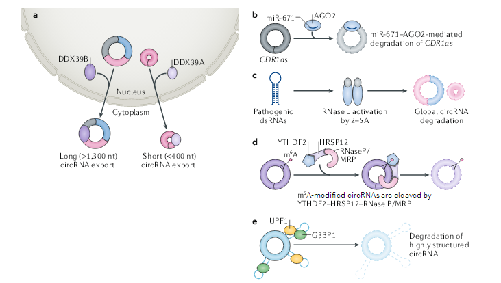 其它的核酸内切酶也参与circRNA的降解。胞质核酸内切酶RNase L在病毒感染过程中病原dsRNA的存在下被激活,之后广泛降解circRNA。核糖核酸酶复合物RNase P / MRP可降解m6A修饰的circRNA。该降解由m6A识别蛋白YTHDF2和HRSP12调控,HRSP12可以连接YTHDF2和RNase P / MRP来介导RNA的降解。此外,高度结构化的circRNA可以被UPF1及其相关的核酸内切酶G3BP1所降解。然而,负责维持正常和未受压细胞中circRNA稳态的其它途径仍尚待鉴定。