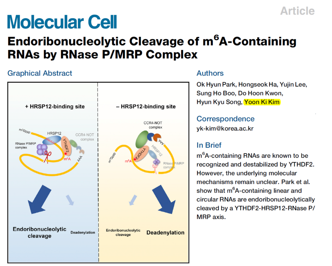 1. Park, O.H., et al., Endoribonucleolytic Cleavage of m(6)A-Containing RNAs by RNase P/MRP Complex. Mol Cell, 2019.