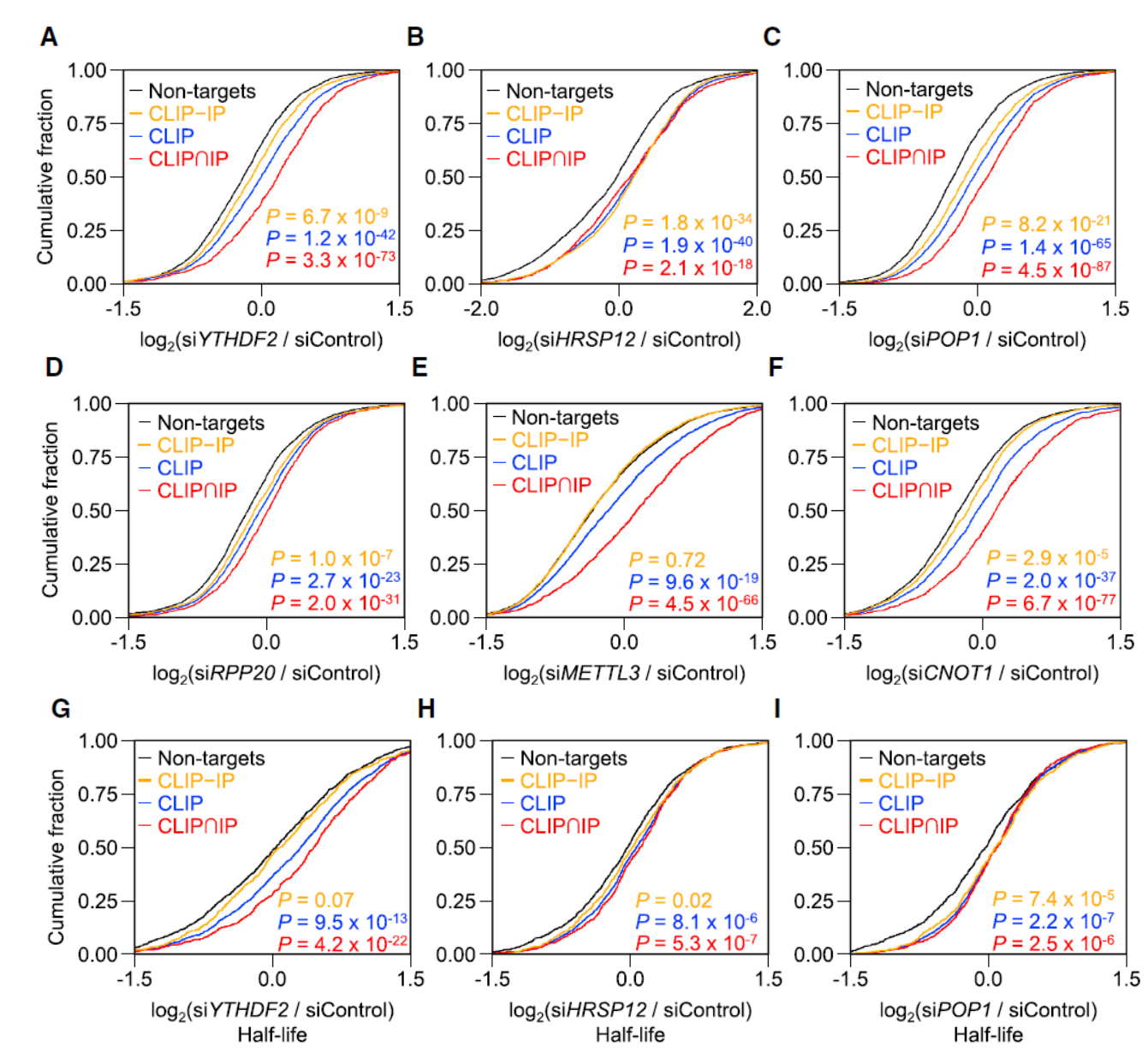 之前有研究报道基于RIP-seq和PAR-CLIP Seq分析了Hela细胞中被YTHDF2结合的分子。基于这些研究基础,可将全转录组中的基因分为四大类:没有被YTHDF2结合分子(Non-targets,3905个),仅在CLIP实验中捕获的(CLIP-IP组,1974个),CLIP组富集的分子(CLIP组,3250个)和同时在CLIP和RIP实验中捕获的(CLIP∩IP,1276个)。在Hela细胞中分别在分别干扰YTHDF2,HRSP12或RNase P/MRP组分,基于上述分组绘制各组的累积分布函数曲线(cumulative distribution function)。结果表明,HRSP12和RNase P/MRP与YTHDF2的结合导致其结合的RNA分子不稳定,表现为已知的可与HRSP12结合的RNA分子分布丰度总体增加,半衰期延长。