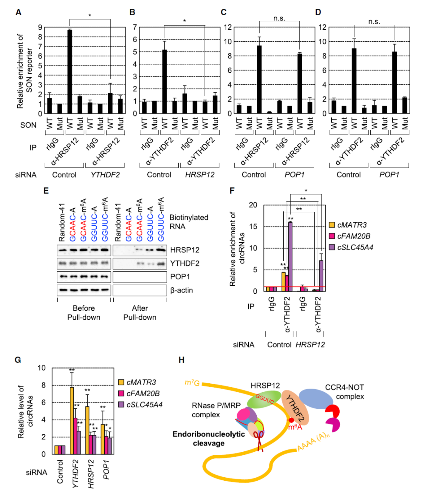 YTHDF2结合的分子中也包含circRNA分子,作者挑选了其中的三种分子进行了分析:cMATR3,cFAM20B和cSLC45A4。结果表明这些circRNA分子可以通过YTHDF2- HRSP12介导的RNase P/MRP复合物结合并降解。