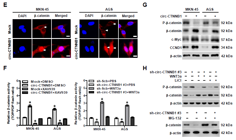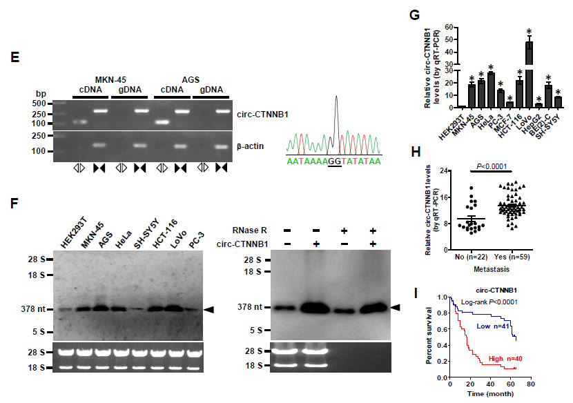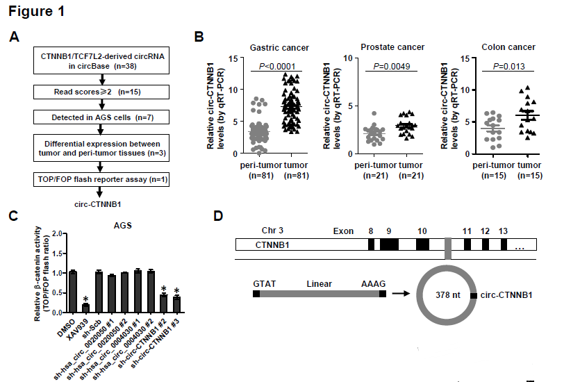 1. 作者通过图1A的方法筛选出CTNNB1基因来源的顺式作用的circRNA——circ-CTNNB1,其在胃癌、前列腺癌和直肠癌中表达上调,敲低circ-CTNNB1表达可以降低胃癌细胞AGS中β-catenin的活性。大小为378nt的circ-CTNNB1实际来源于CTNNB1基因的10号内含子,而且耐受RNase R的消化降解,可在大多数肿瘤中检测到circ-CTNNB1的高表达,在发生转移的肿瘤中circ-CTNNB1的表达水平更高,进一步分析显示circ-CTNNB1的高表达与临床病人的存活率低高度相关。