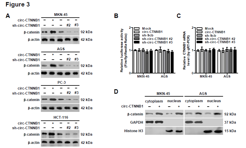 1. Yang F,et al. Cis-acting circ-CTNNB1 promotes β-catenin signaling and cancer progression via DDX3-mediated transactivation of YY1. Cancer Res. 2018 Dec 18. pii: canres.1559.2018. doi: 10.1158/0008-5472.CAN-18-1559.