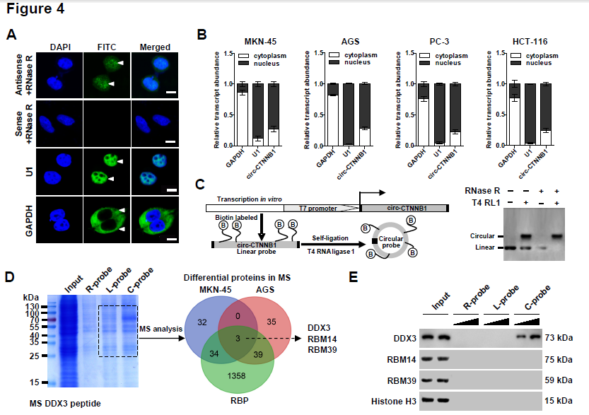 4. circ-CTNNB1发挥功能需要借助什么蛋白partners?RNA-FISH和亚细胞组份分析证明circ-CTNNB1主要定位于胞核中,借助特异性biotin标记的circ-CTNNB1进行RNA pull-down蛋白复合物后再质谱分析蛋白的实验,结合两种细胞株的结果和RBPs数据库筛选出了三种RBPs蛋白,体外再次利用biotin标记的RNA pull-down实验进行二次验证,发现只有DDX3可以与circ-CTNNB1结合,并呈现剂量依赖性;同样地,RNA-FISH、RIP和RNA-EMSA实验均证明了circ-CTNNB1与DDX3相互结合。