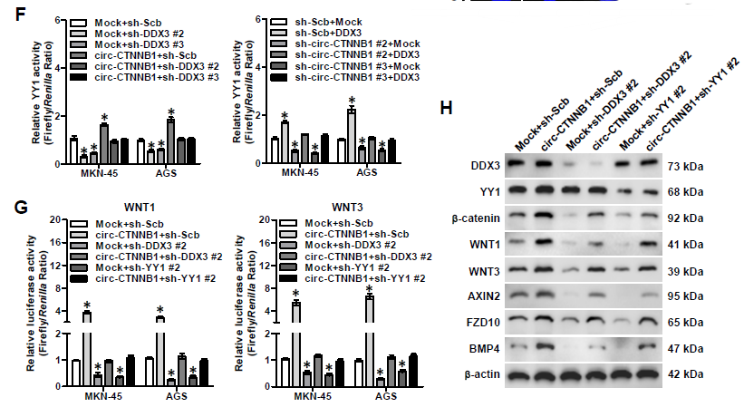 6. 下一步作者继续深入探究circ-CTNNB1的下游靶基因,通过circ-CTNNB1过表达后RNA-seq分析相关基因的变化,发现1244种基因出现上调,986种基因出现下调;GO分析发现差异表达的基因大部分与Wnt信号通路相关,包括WNT1, WNT3,AXIN2, FZD10和BMP4这五种基因。通过图6B的方法筛选出共同调控这些与Wnt信号通路基因的转录因子,主要是ERG、SP1和YY1。作者发现只有敲低YY1的表达才可以抑制circ-CTNNB1诱导上调的β-catenin表达。Co-IP和BiFC实验均证明了DDX3与YY1相互结合,而且circ-CTNNB1过表达促进,而RK-33处理抑制两者的相互结合。双荧光素酶报告基因实验证明了circ-CTNNB1和DDX3表达对于促进YY1转录活性的重要性,也证明了circ-CTNNB1、DDX3和YY1表达对于促进Wnt信号通路相关的WNT1、WNT2、AXIN2, FZD10和BMP4基因的表达的重要性。