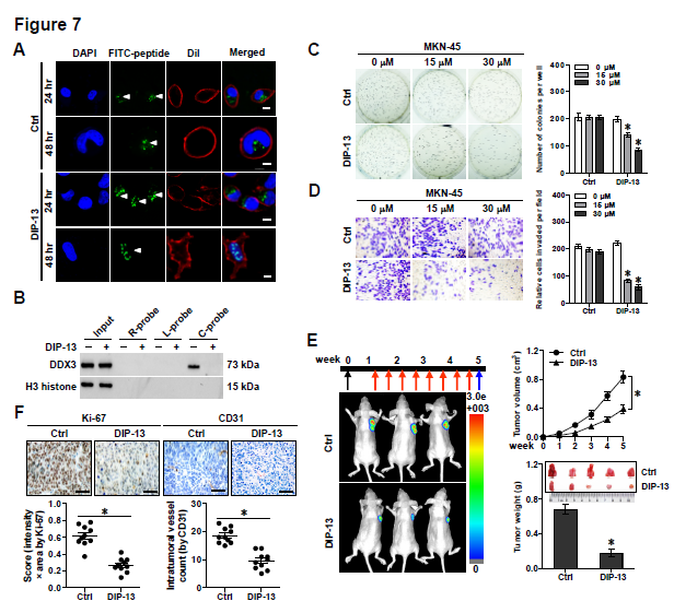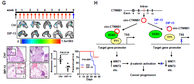 7. 靶向circ-CTNNB1-DDX3结合对肿瘤治疗效应的影响?circ-CTNNB1表达敲低的细胞在小鼠体内成瘤和转移的能力会明显降低,小鼠存活率也都得到明显提高,说明靶向。circ-CTNNB1可以获得很好的抗肿瘤效应。接着作者针对circ-CTNNB1-DDX3结合的重要区域研发了一种细胞通透性的靶向DDX3的长度约为13aa的抑制性肽(DIP-13),通过IP和荧光素酶报告基因实验证明其可以体外明显抑制circ-CTNNB1-DDX3相互结合,同时体外应用抑制肿瘤的生长、增殖和侵袭能力(C,D)。通过分析成瘤体积、肿瘤肿瘤、Ki67增殖指数、CD31阳性的微血管形成和下游基因表达情况等指标,动物体内成瘤实验发现应用该DIP-13抑制肽可以明显抑制小鼠的体内成瘤能力、抑制肿瘤的肺转移情况和提高小鼠存活率。