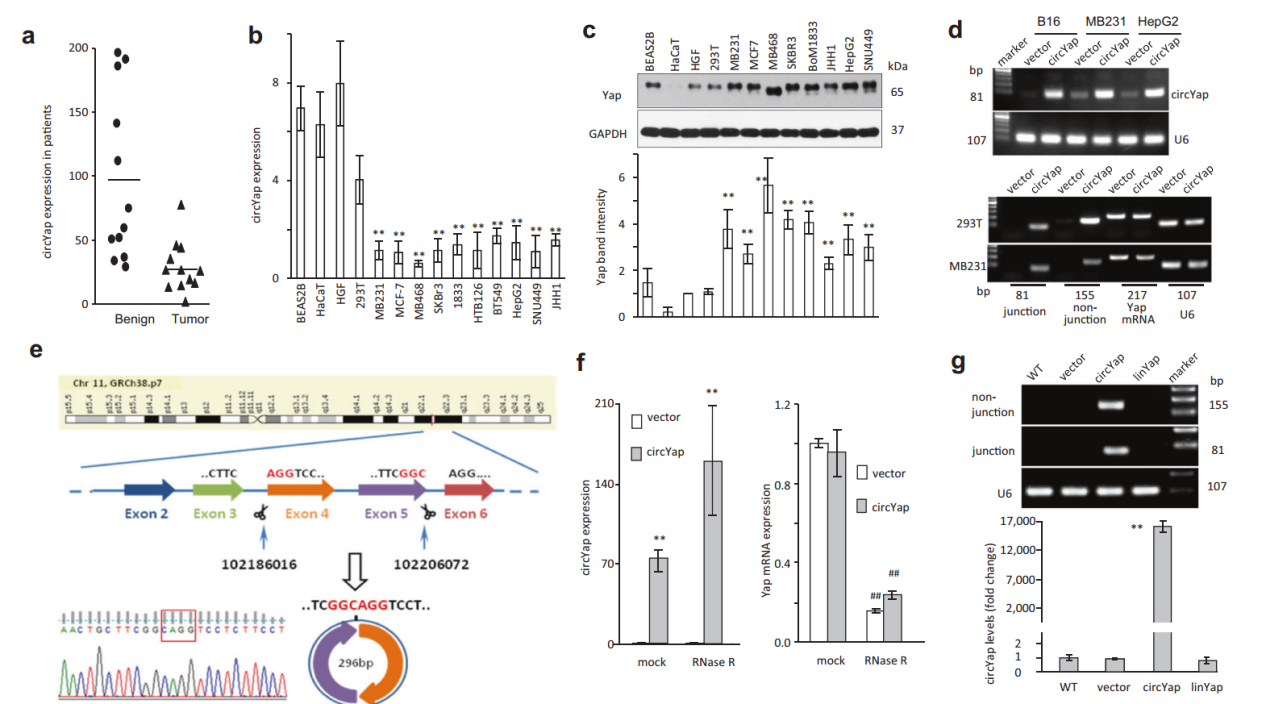 YAP是Hippo通路的关键分子之一,与肿瘤发展进程密切相关。本文作者发现来自YAP1基因的4-5外显子的circRNA,circYAP(circBank ID:hsa_circYAP1_008)可以通过结合翻译起始蛋白eIF4G和PABP,抑制母基因YAP的mRNA翻译起始,调控YAP蛋白的表达量,首次发现circRNA通过调控翻译起始效率调控母基因功能。下面就让我们一起学习一下这篇文章如何一步步发现这一新颖的机制的: