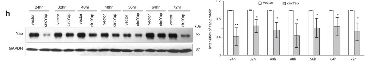 有趣的是,在过表达circYAP之后,YAP蛋白的表达水平显著降低。