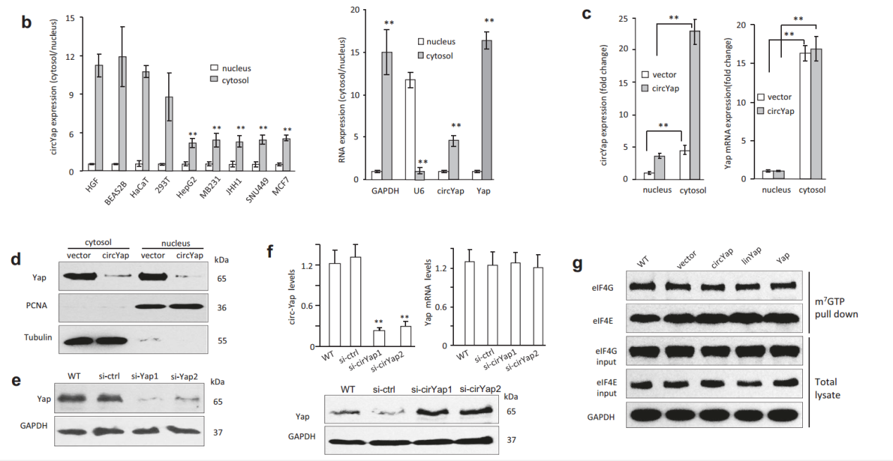 过表达circYAP不影响YAP蛋白的亚细胞定位和YAP mRNA的表达量。干扰circYAP也不影响YAP mRNA的表达量,但却能显著增加YAP蛋白的表达量。这些结果进一步表明circYAP并非通过影响YAP mRNA的表达状态影响YAP蛋白的表达丰度。m7GTP pull-down可以用于分析效率,作者分析了过表达circYAP,对应序列的linear YAP及全长YAP mRNA等过表达条件,结果显示几组均有正常的翻译过程,表现为eIF4G,eIF4E可以被有效捕获。