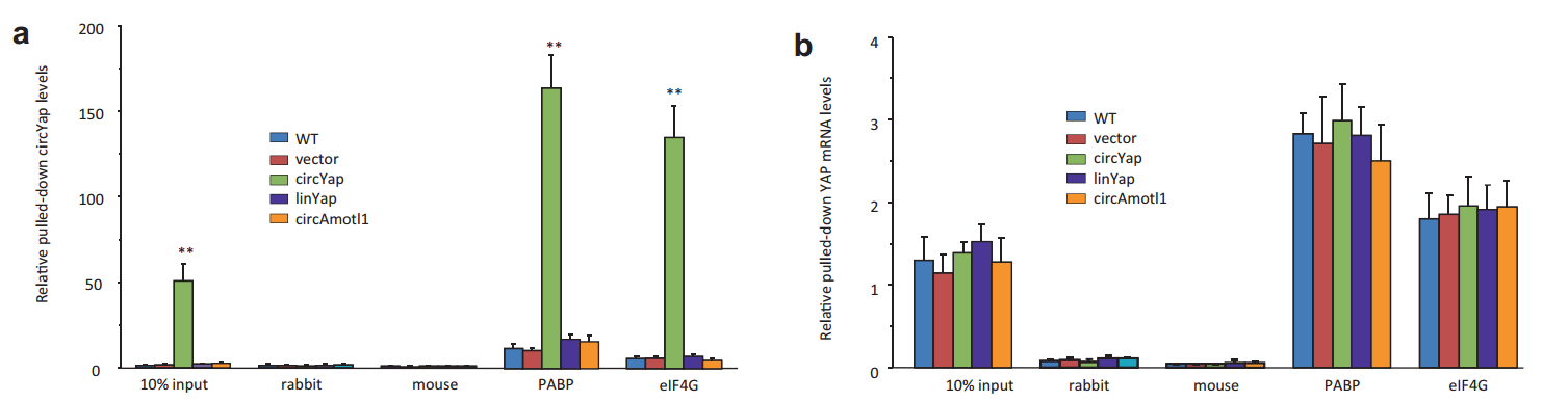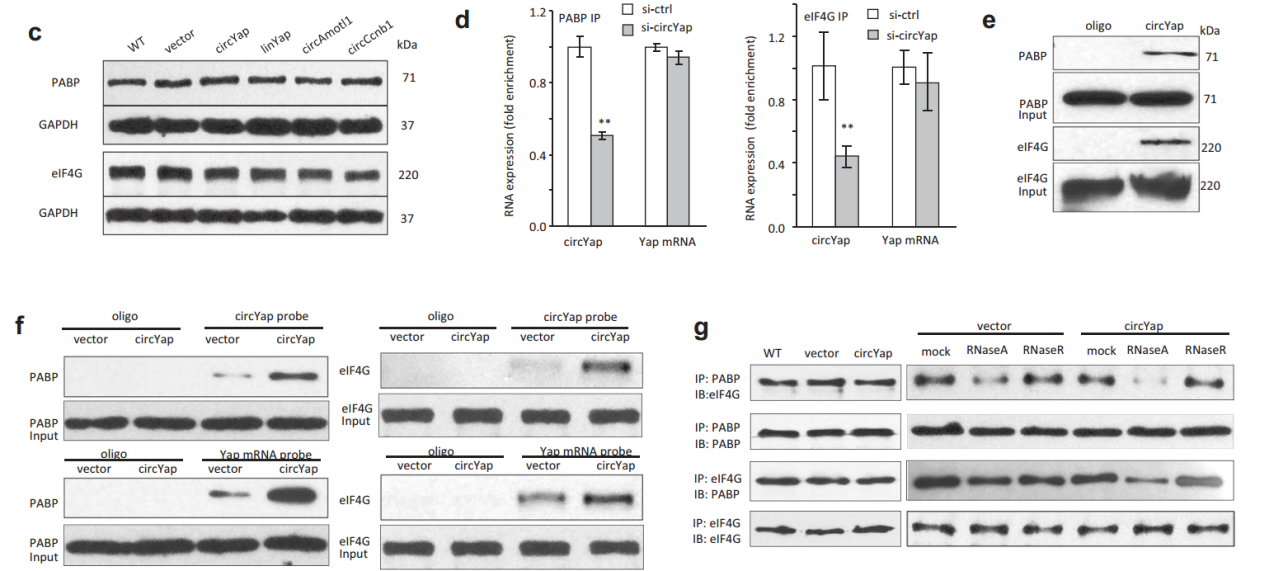 从上述结果不难看到,过表达circYAP并不能显著改变eIF4G和eIF4E结合在m7G的状态,说明circYAP不会广泛影响mRNA的翻译状态,或许是YAP基因特有的一种调控机制。为进一步探究这一现象,作者首先分析了circYAP与翻译起始过程有关的蛋白的相互作用情况,结果发现circYAP可以结合eIF4G和PABP。RNA pull-down实验证明circYAP可结合eIF4G和PABP,但与circYAP序列一致的线性RNA却不能。有趣的是,过表达circYAP并不影响eIF4G和PABP与YAP mRNA的结合。