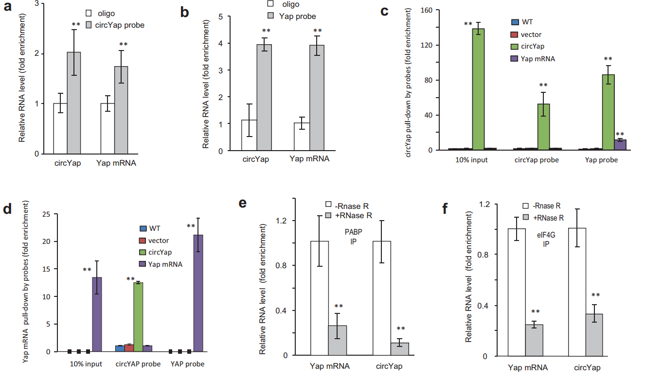 除了eIF4G和PABP蛋白,作者也基于RNA pull-down验证了circYAP与YAP mRNA的相互作用情况。结果表明circYAP与YAP mRNA可以被相互捕获。
