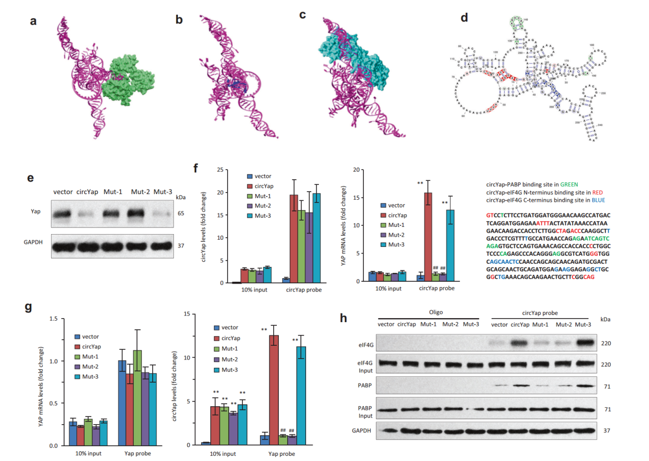 进一步,基于分子模拟比对(docking)分析,作者进一步分析了circYAP与YAP mRNA,eIF4G和PABP相互作用的碱基位点,然后构建了这些位点的突变体(Mut-1,2),其中Mut-1为circYAP与YAP mRNA相互作用位点的突变体,Mut-2为circYAP与eIF4G和PABP相互作用的位点的突变体,Mut-3为不相关位点的突变对照。结果显示,过表达Mut-1和Mut-2显著增加YAP蛋白的表达水平,但Mut-3和野生型circYAP则抑制YAP蛋白的表达量。RNA pull-down实验也表明Mut-1和Mut-2不能有效捕获YAP mRNA及eIF4G和PABP蛋白。