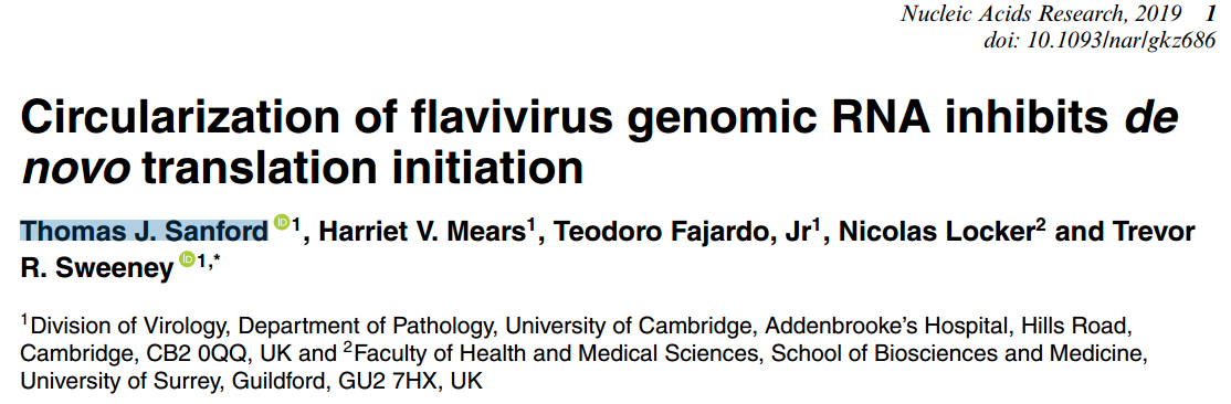 Sanford, T. J., Mears, H. V., Fajardo, T., Locker, N., Sweeney, T. R. (2019). Circularization of flavivirus genomic RNA inhibits de novo translation initiation. Nucleic Acids Research. DOI: 10.1093/nar/gkz686