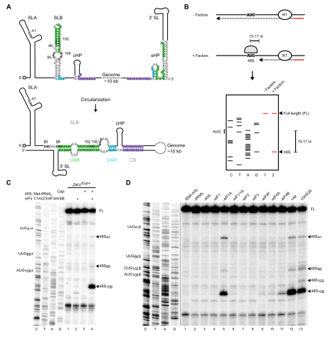 为了研究黄病毒翻译的机制,作者在体外重建了ZIKV 基因组RNA的翻译起始体系。这种方法以前曾用于成功探索细胞戴帽结构依赖性和病毒IRES(核糖体进入位点)依赖性翻译的机制。通过兔网织红细胞裂解物或大肠杆菌获得EIF(真核翻译起始因子)和小核糖体亚基的纯化蛋白。将EIF与体外转录的RNA(携带ZIKV病毒的 5’UTR和衣壳蛋白前252个核糖核苷酸,ZIKV5’utr+)一起温育。由于组装的48S复合物可以阻止逆转录酶,导致在起始密码子下游15-17nt处产生截短的cDNA产物,因此可以通过引物延伸抑制实验以测定48S复合物的组装。该技术的示意图如图1B所示。