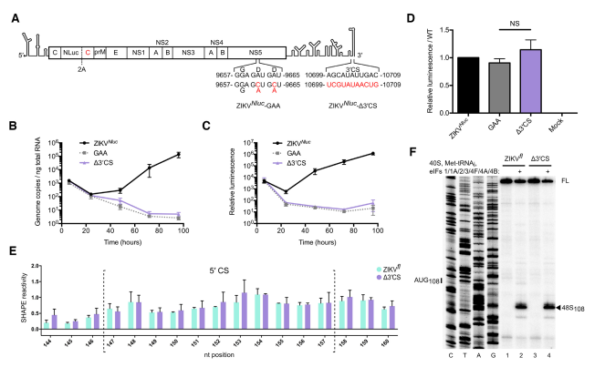 所有RNA的基因组拷贝数在电穿孔后6和24 h之间降低,48小时后,WT RNA回升,但ZIKVNluc-GAA突变体不能复制。ZIKVNluc-Δ3’CS突变体RNA与ZIKVNluc-GAA突变体一样,转入细胞后ZIKV不能进行复制,表明ZIKV病毒复制需要完整的5′-3’环化序列的相互作用。病毒基因组的翻译与RNA复制的动力学一致。重要的是,转入细胞6 h后,此时转入WT RNA、ZIKVNluc-GAA和ZIKVNluc-Δ3’CS细胞中ZIKV的基因组拷贝数是一致的,并且这三种细胞中荧光素酶的量相似,表明WT和Δ3’CS突变体在该实验系统中RNA以相同的效率翻译。