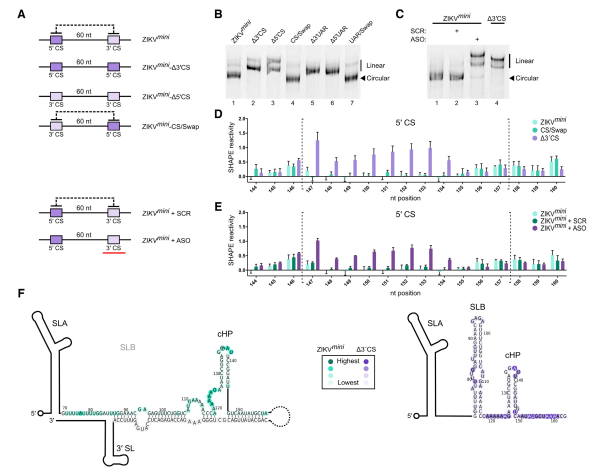 SHAPE分析显示体外转录的ZIKVfl RNA采用线性构象。作者假设减少UTR的~10kb可能增加环化的可能性。因此,作者构建了ZIKV小基因组(ZIKVmini),其在未改变的5’和3’个UTR中间加上60 nt的接头。以ZIKVmini为背景,构建了突变体,如图所示。首先通过天然PAGE检查ZIKVmini的构象。环状RNA的结构更紧凑,因此比线性RNA迁移更快。 一致地,ZIKVmini- 3 ’CS和ZIKVmini-5’CS比WT ZIKVmini迁移慢。而ZIKVmini-CS/Swap与WT迁移速度一样,表示,ZIKVmini- 3’ CS和ZIKVmini-5’ CS RNA为线性的,ZIKVmini-CS/SwapRNA中有碱基配对。