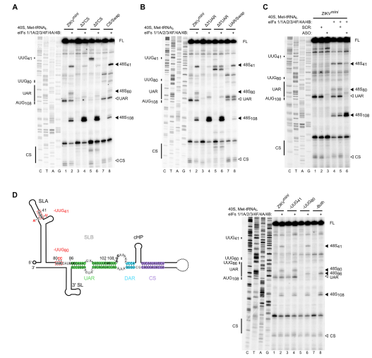 作者接下来在加帽的ZIKVmini RNA上进行体外重建。与WT ZIKVfl RNA相反,在WT ZIKVmini的起始AUG108处检测到少的48S复合物组装。5’或3’CS元件的突变(RNA不能环化),增加了该位点的48S复合物的形成,同时ZIKVmini-CS/Swap(5’CS和3’CS交换,可以环化)中AUG108处也检测到较少的48S复合物组装,表明对翻译起始的影响不是由于突变,而是由于基因组环化。与CS区突变类似,5’或3’UAR序列的突变也刺激了48S复合物的形成,而5’-3’ UAR交换再次逆转了这种影响。