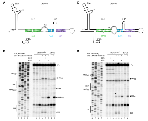 由于环化是所有黄病毒的共同特征,所以作者研究了环化是否也影响DENV的翻译起始。作者检测了DENV1或DENV4的5’和3’UTR的mini基因组RNA的48S复合物组装。作者用与ZIKVmini RNA的方法相似的方法,通过突变3’ CS或添加与3’环化元件互补的短ASO来破坏基因组环化。与ZIKV一样,环化抑制DENV1mini和DENV4mini基因组RNA的从头翻译起始,而环化的破坏增强了真实起始AUG上的48S复合物形成(DENV1中的AUG95和DENV4中的AUG102。与ZIKV一样,观察到DENV RNA的上游UUG48的增强选择,与环化形式的扫描缺陷一致。总的来说,作者的数据表明基因组环化是不同的黄病毒用于控制基因组使用的保守机制。