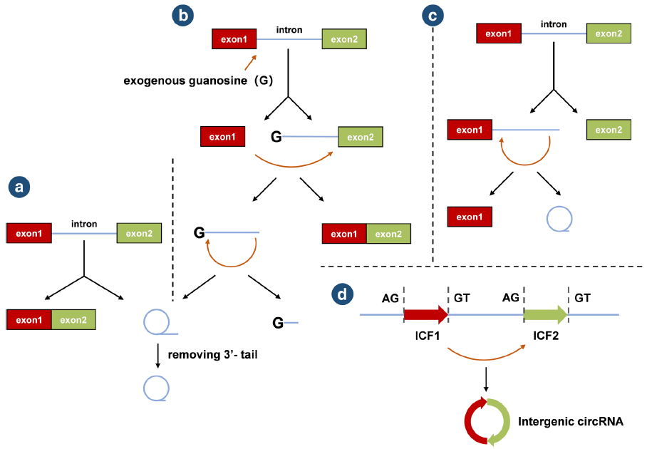 - 剪切的I型内含子形成circRNA:外源性鸟苷攻击内含子的5’端,通过转酯反应切除1号外显子;游离1号外显子的3’端羟基攻击2号外显子的5’端,形成线性内含子;靠近线性内含子3’端的2’羟基攻击5’端的磷酸二酯键,导致含有2’,5’—磷酸二酯的RNA套索形成和释放5’端的序列;最后切除RNA套索的3’尾巴,形成I型内含子的circRNA;