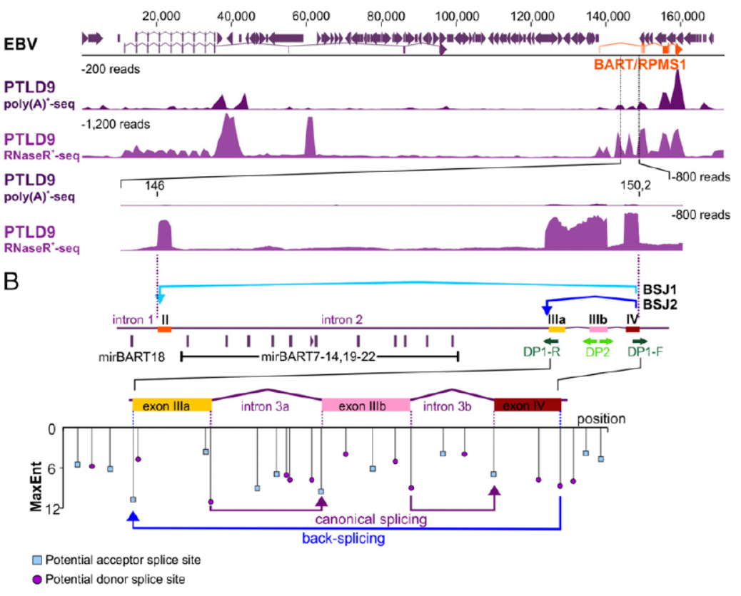 按照文章的描述,作者一开始是为了寻找EBV阴性的移植后淋巴组织增生性疾病(PTLD)患者是否有未知的新型致瘤性病毒(human tumor viruses),此前曾有报道通过Poly-A测序的方法寻找到Merkel细胞多瘤病毒,但这种测序方法可能会漏掉环状RNA基因组的信息,因此作者希望能利用环状RNA的测序方法找到全新的致瘤性病毒。在比较EBV阳性和阴性的PTLD标本中发现了来自EBV基因组基因产生的circRNA分子。